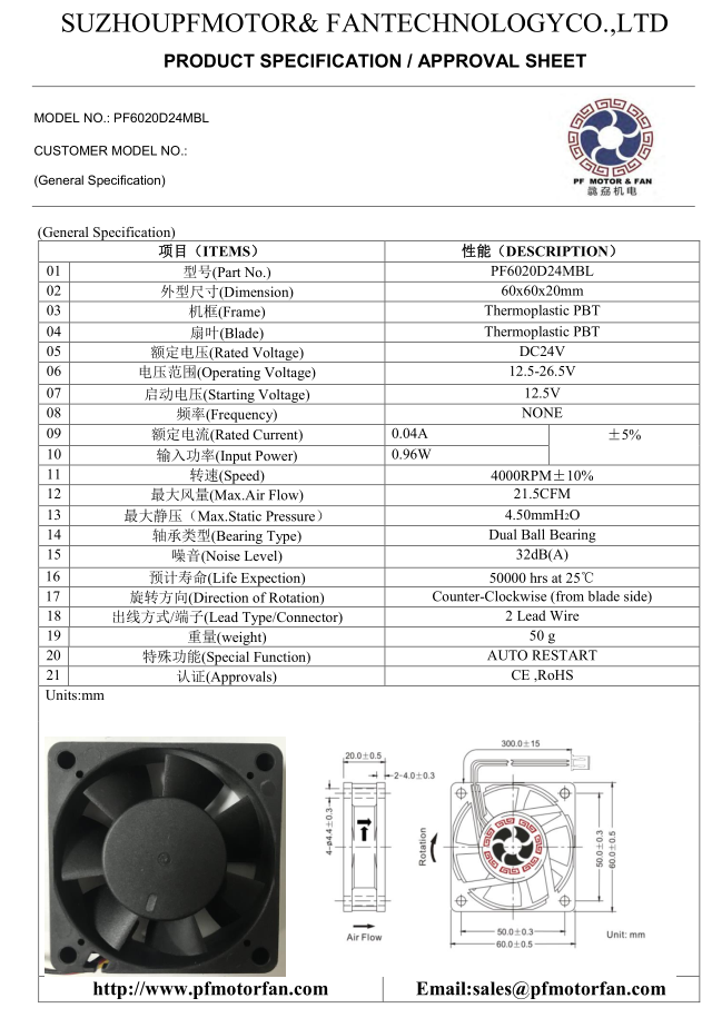 Motor: Brushless DC, auto restart Impedance & polarityprotected